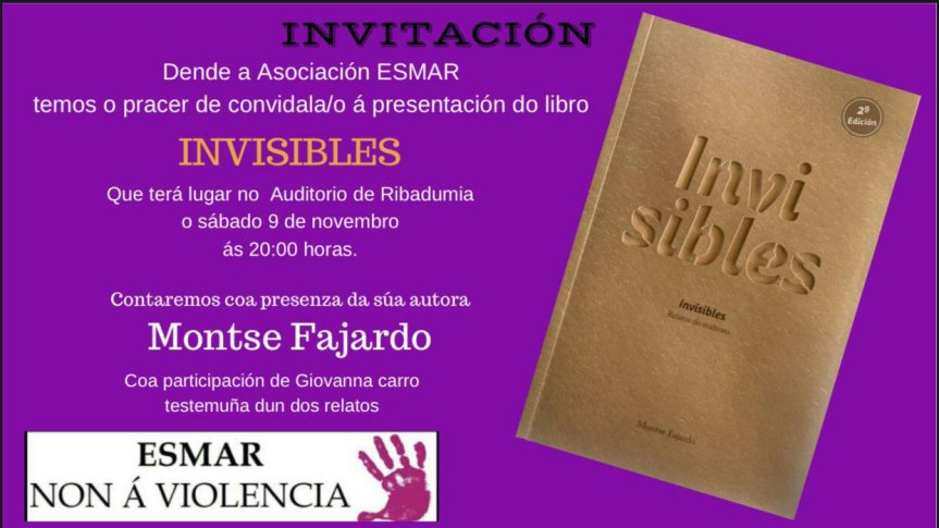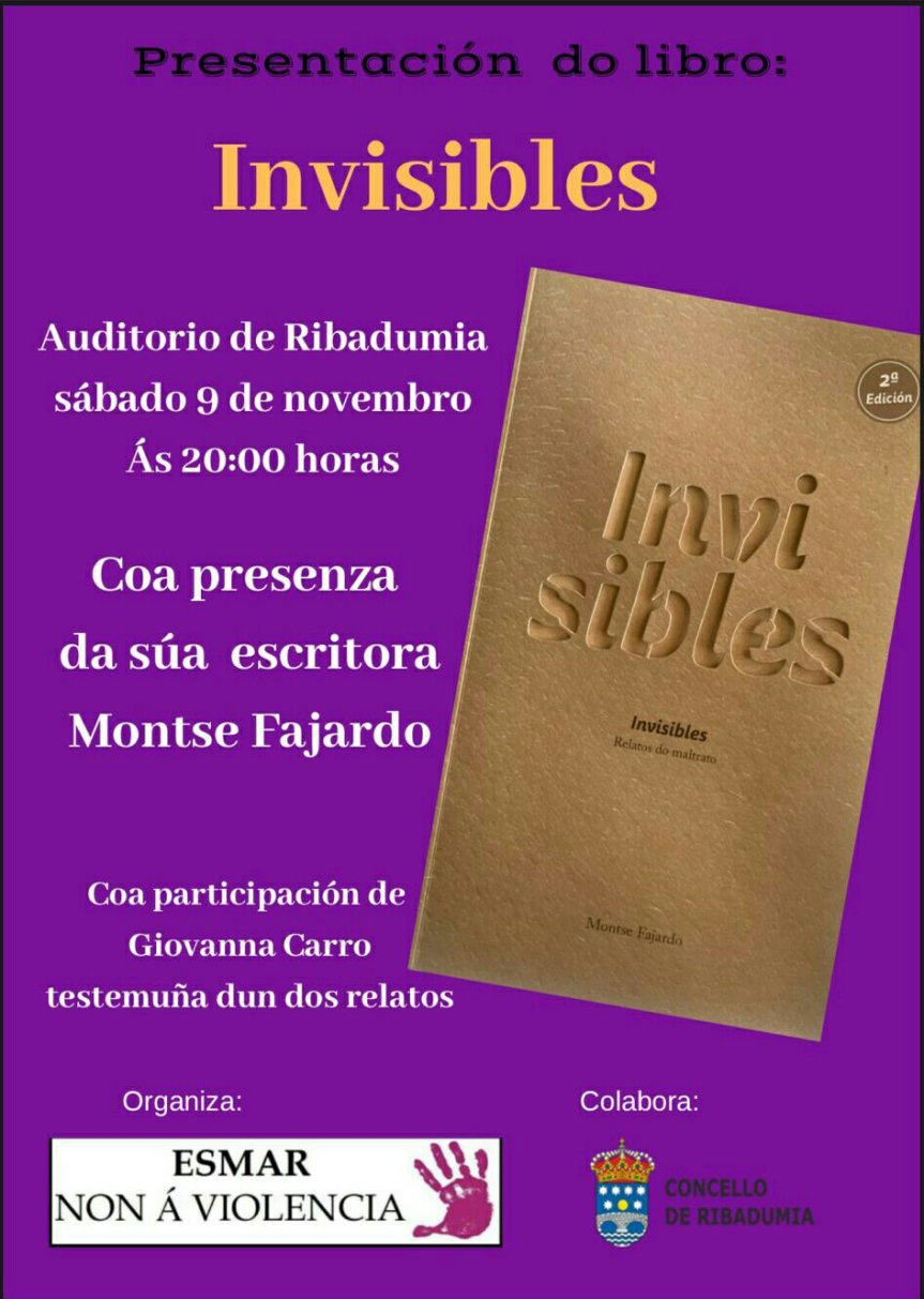 O próximo sábado día 9 de novembro as 20:00 horas no auditorio de Ribadumia presentaremos o libro INVISIBLES presentado pola escritora Montse Fajardo, está basado en feitos reais. Contaremos tamen coa presenza dunha testemuña dun dos relatos.